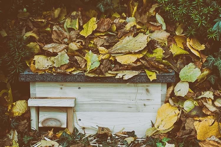 Das Igelhaus deckten wir mit kurz geschnittenem Gras und Blättern zur Tarnung ab. Für die Überwinterung bedeckten wir das Haus zusätzlich mit Ästen und verankerten diese mit Zeltheringen am Boden.„